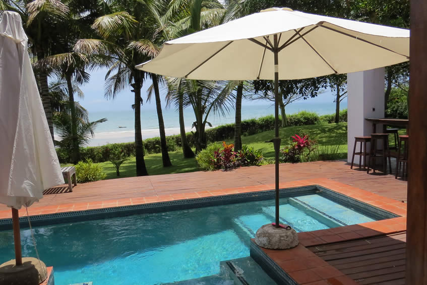 Dining area leading on to pool deck with outdoor bar and entertaining area. All with a delightful vista of the Indian Ocean through an established palm grove.